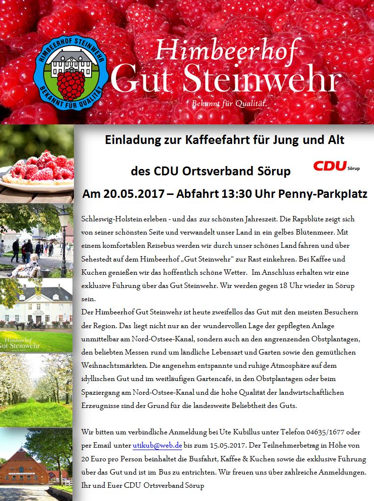 Wir bitten um verbindliche Anmeldung bei Ute Kubillus unter Telefon 04635/1677 oder per Email unter utikub [at] web.de bis zum 15.05.2017. Der Teilnehmerbetrag in Höhe von 20 Euro pro Person beinhaltet die Busfahrt, Kaffee & Kuchen sowie die exklusive Führung über das Gut und ist im Bus zu entrichten. Wir freuen uns über zahlreiche Anmeldungen. Ihr und Euer CDU Ortsverband Sörup