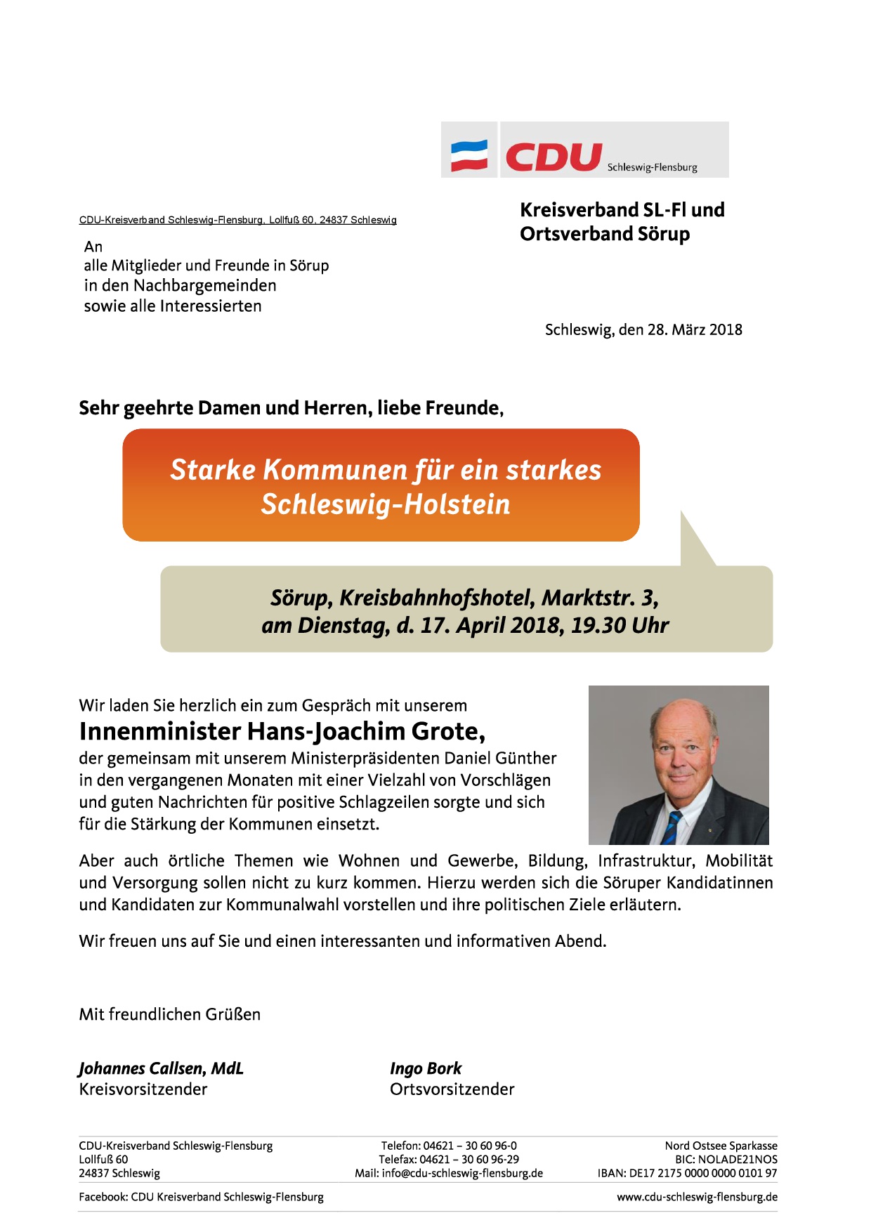 Wir laden Sie herzlich ein zum Gespräch mit unserem Innenminister Hans-Joachim Grote, der gemeinsam mit unserem Ministerpräsidenten Daniel Günther in den vergangenen Monaten mit einer Vielzahl von Vorschlägen und guten Nachrichten für positive Schlagzeilen sorgte und sich für die Stärkung der Kommunen einsetzt.